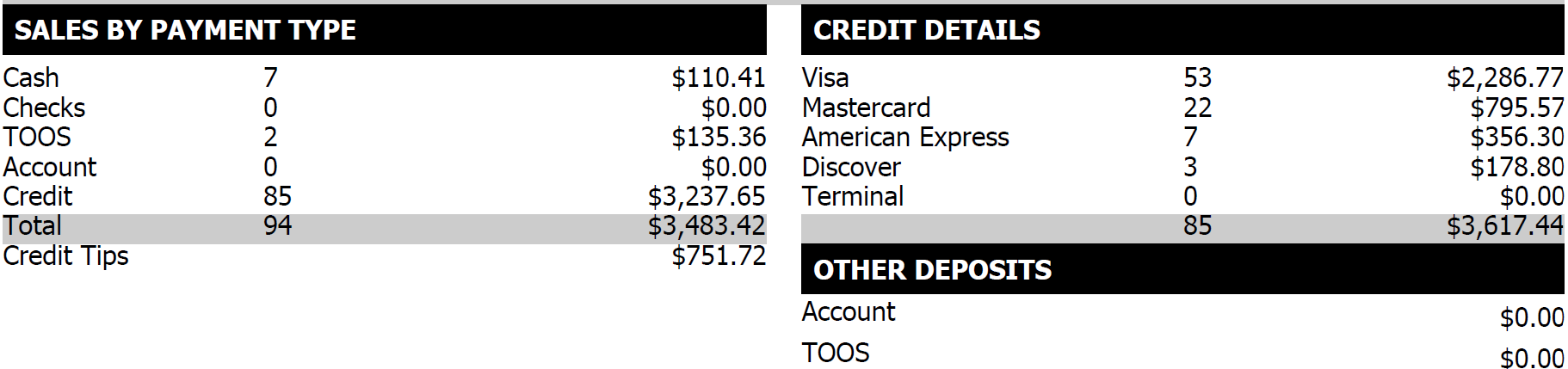 The sales of the orders by payment type. It includes delivery fees and tax. It does not include tips. The TOOS and Account “payments” are not deposited until a later date. The payments are compared to the order totals. In theory every payment must match the order total. There are occasions where the payment does not match the order and they are displayed under SALES BY PAYMENT TYPE.